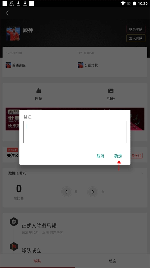 5、在备注框中填写自己个人的球技和具体信息,填好后点击确定即可,后期会有队长查看你的申请信息,当队长通过你的申请就可以加入球队了。