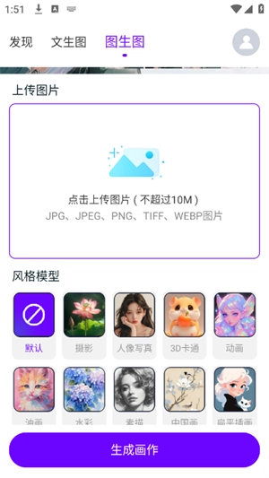 5、点击“图生图”功能,上传图片,然后从油画、水彩、素描等众多模型中,挑选自己心仪的模型。
