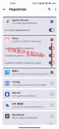3.点击【配置MagiskHide】进入,将【momo】这一栏中的四个开关都开启打钩;