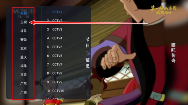 2.点击手机屏幕,可以看到左侧会显示央视、卫视、地方台节目单,在这里小编以点击卫视为例