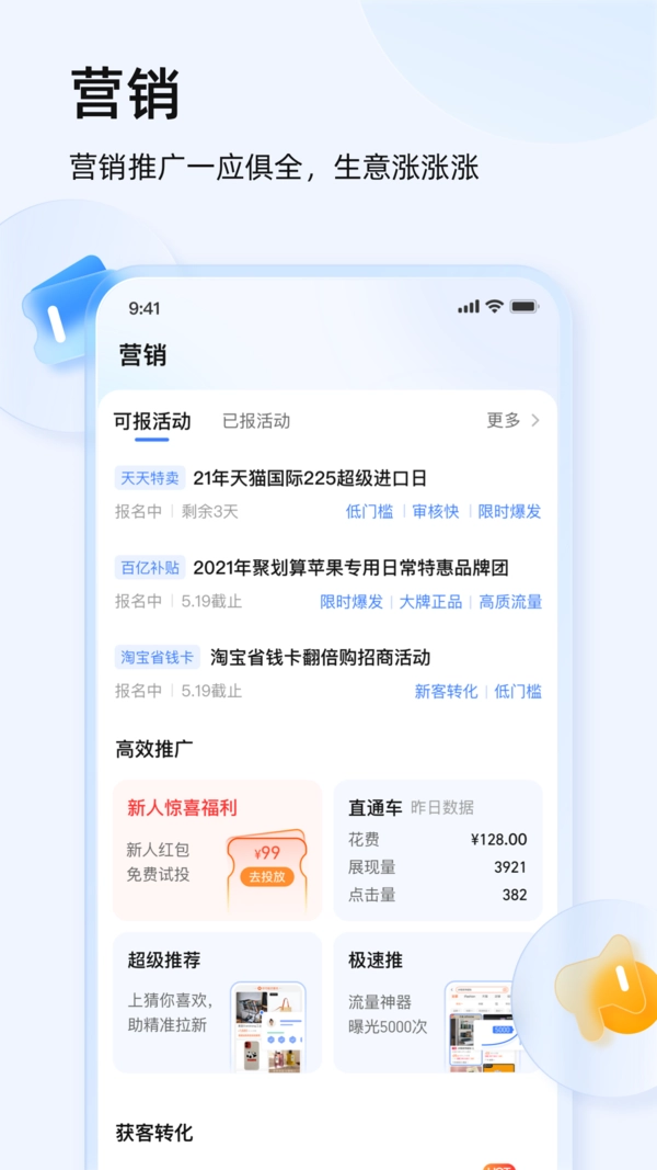 ·整合多渠道营销玩法,集免费站内流量、高效推广、获客转化于一体的营销能力集合页。新增一键分享能力,助力商家高效获取站外流量