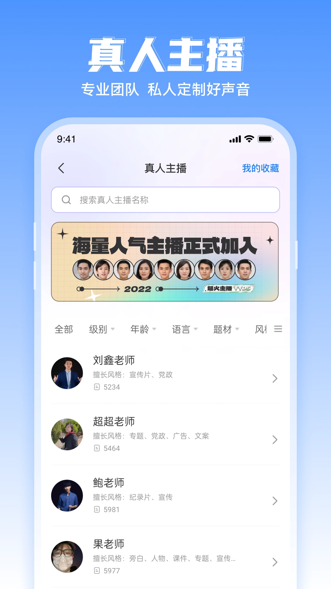 2、平台汇聚了各类主播,用户可随时在线挑选最适配的主播,实现配音转换。