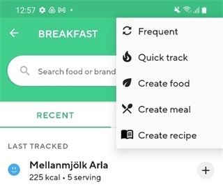 最近的:左侧的此部分显示您的跟踪历史记录,通过单击右侧的“+”,您可以轻松地重新跟踪最近添加到用餐中的项目