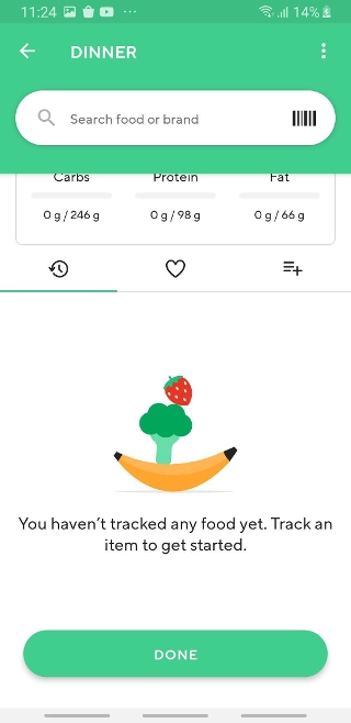 与昨天一样:当您想跟踪与以前相同的食物时,此部分很方便-您可以找到日记中列出的所有食物,并可以通过单击右侧的“+”进行跟踪