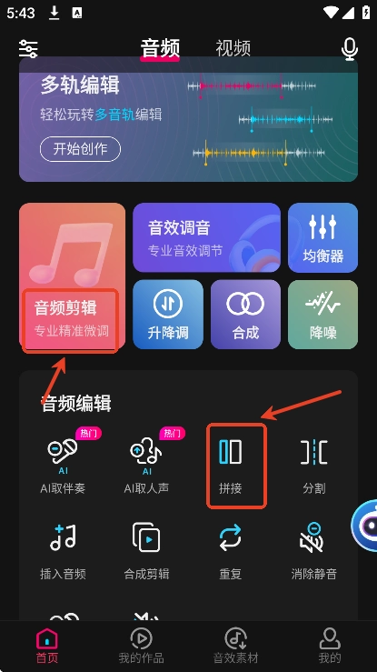 1、用户可以利用音频剪辑与拼接功能,对音频进行精准裁剪、剪辑或删除片段,还能拼接多首歌曲,甚至在音频任意位置插入多段音频,实现个性化音频组合。