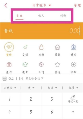 3、接着便进入了记账页面,可选择支出、收入或者转账类型。