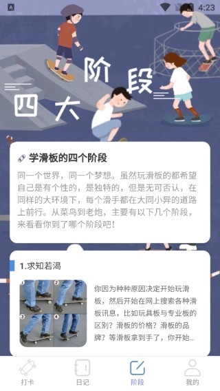 软件中提供了与滑板相关的各种知识技巧,用户可以在线记录下自己学习滑板的过程