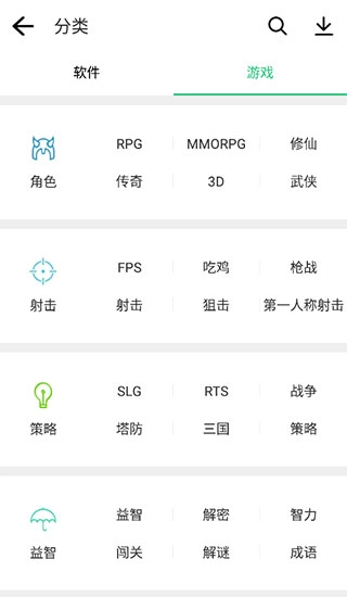 2、点击“游戏”分类,接着依据游戏类型进行筛选,就能找到同类型的软件了。