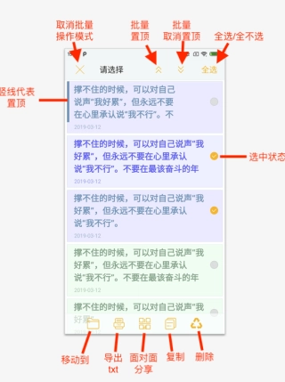 ● 在首页长按任意一条便签,即可进入批量操作模式,具体可参考下图