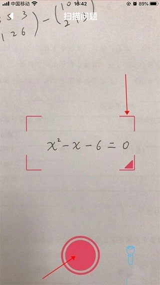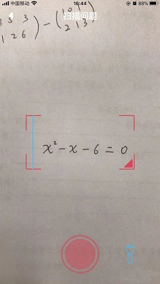 3、开启手机摄像头,把题目放到屏幕提示的区域里,接着点击下方的红色按钮;