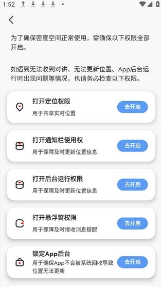 1、双方完成安装后即可打开应用,进入聊天页面后点击【去开启】按钮,完成相关权限的开启操作。