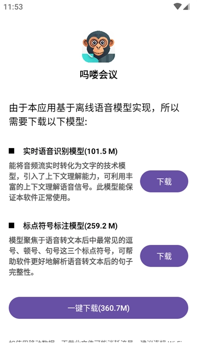 3.初次使用语音识别功能时,系统需要对应的语音模型支持,点击“一键”按钮即可获取所需的语音模型。