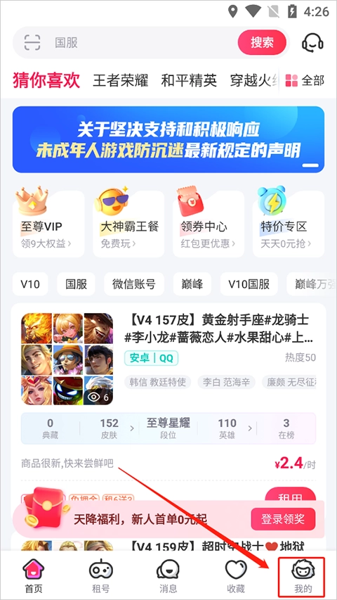 1、首先登录租号玩平台,点击页面右下角的【我的】按钮,进入个人中心界面。