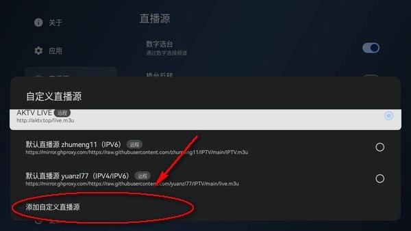 3、接下来就能切换不同的直播源了,目前系统自带三个,默认选用第一个;要是想更换直播源,点击“添加自定义直播源”即可操作。