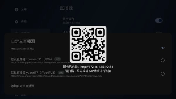4、接着用手机扫描二维码,也可以在手机浏览器里输入IP地址来完成连接,等连接成功后,导入直播源即可。