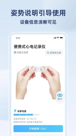 1、设备互联:一键连接心电监测设备,24小时不间断记录心电活动。