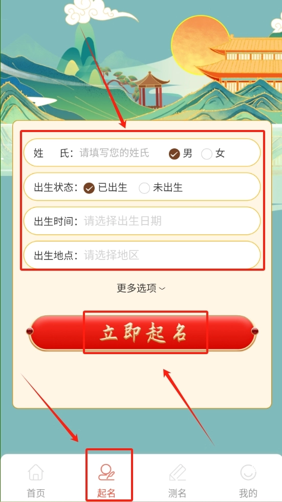 2、想给孩子起新名字的话,直接点起名功能,按提示填好出生信息就能出结果。