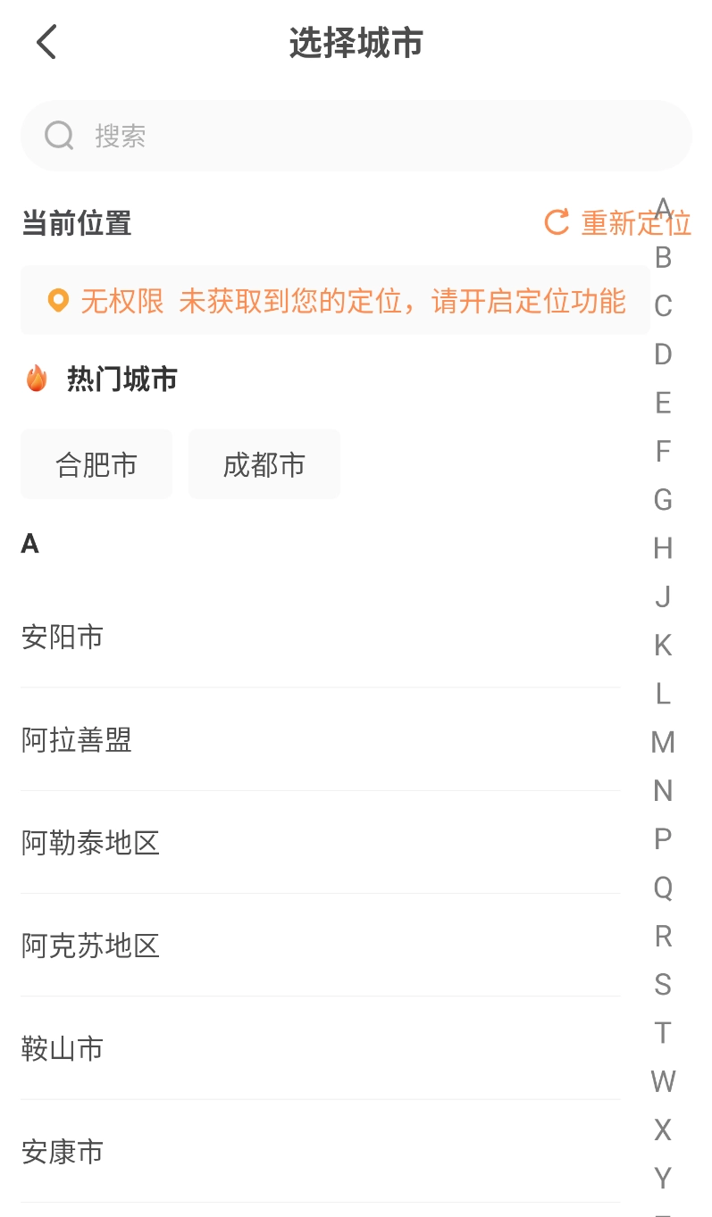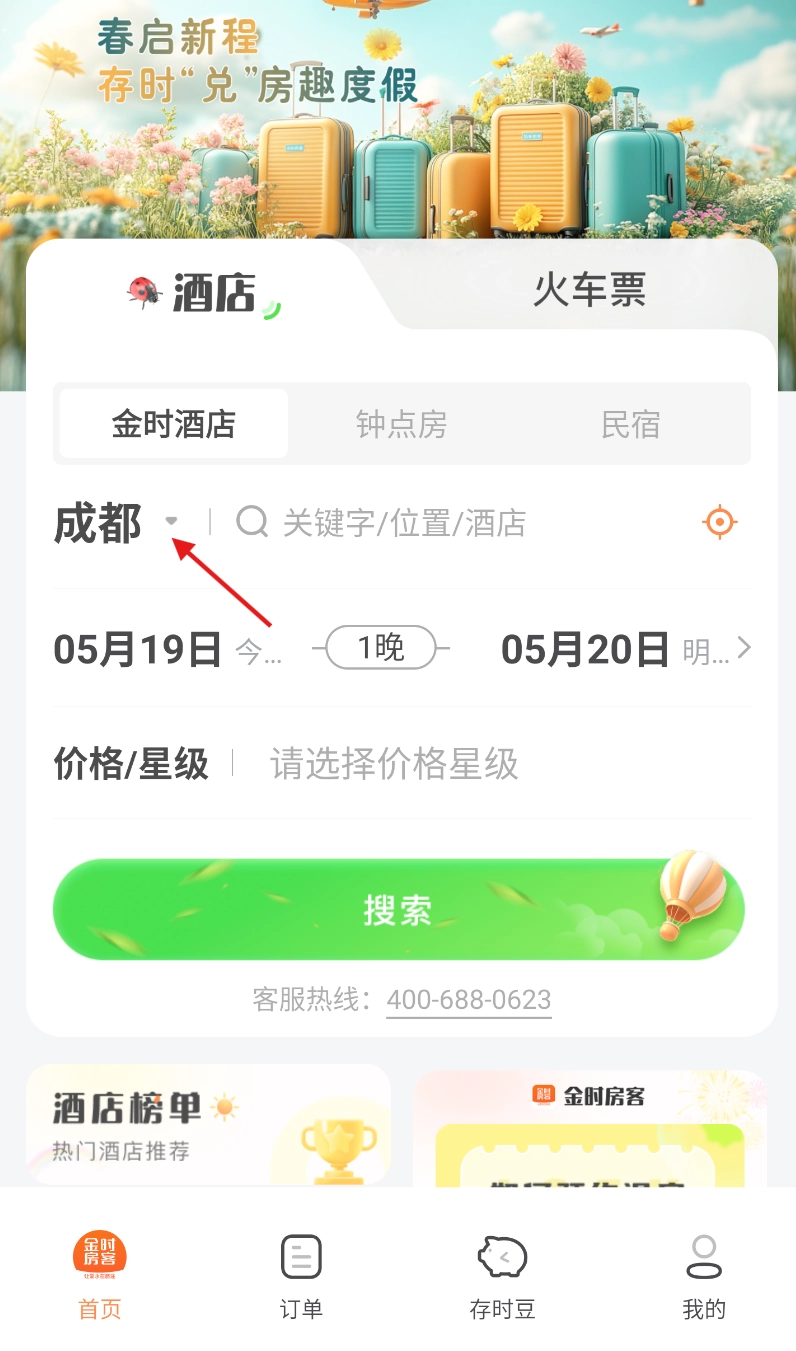 1、启动金时房客应用,在主界面找到显示城市名称的区域,点击该区域后选择想要预订的目标城市。