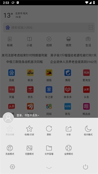 2、点击正下方的图标,可使用收藏/历史、夜间模式、无痕模式等功能。