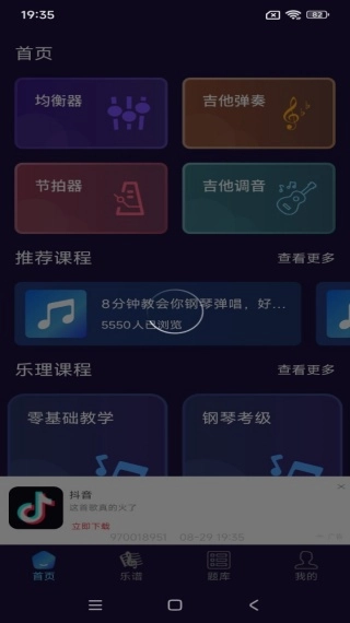 2、首页提供均衡器、吉他弹奏、节拍器、吉他调音等功能。