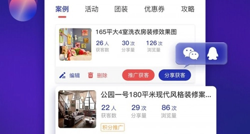 专属的报价获客工具+免费量房获客工具+发起团装活动(精准获取同小区业主订单)+优惠活动获客(吸引签单神器)+装修优惠券(储蓄大量意向客户、逐渐转化)。长期裂变是分享传播,一个视频/案例不断传播,持续获客!源源不断的客户咨询+品牌推广。