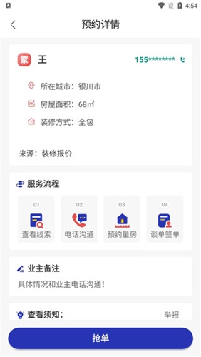 3、选择你想要的客户即可进行抢单,你还可以看到该客户的所在城市、房屋面积、装修方式等;
