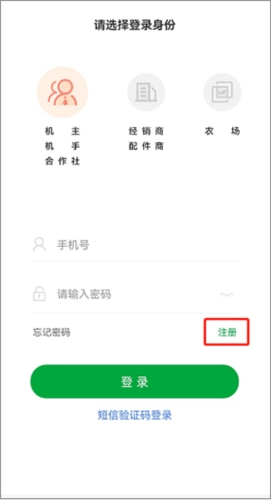 1、智农雷沃安装以后,选择您的身份,点击注册按钮;