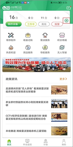 1、在本站智农雷沃并安装打开,成功登录以后,点击首页右上角的“+”按钮;
