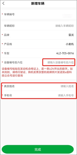 4、新增车辆页面,输入设备号后六位、姓名、手机号点完成即可完成绑车;