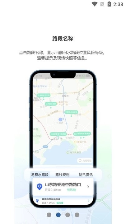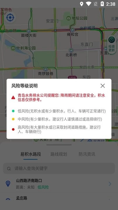 点击路段名称,即可查看当前积水路段的位置、风险等级、温馨提示以及现场快照等相关信息。