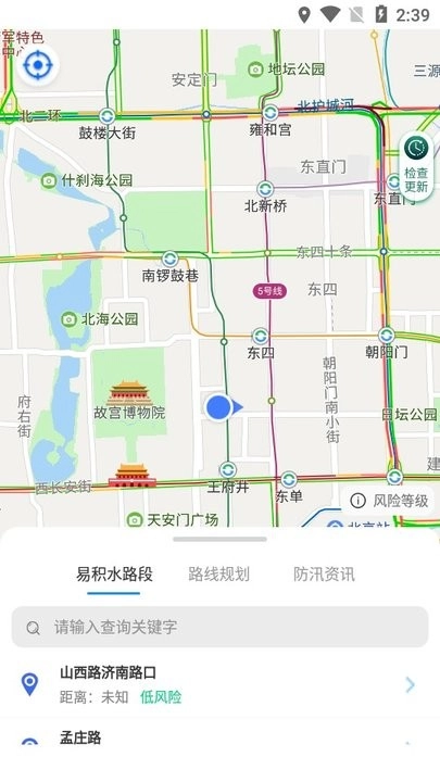 关闭弹窗后,地图上会呈现各易积水路段的具体位置及其名称,底部的功能菜单支持向上滑动展开。