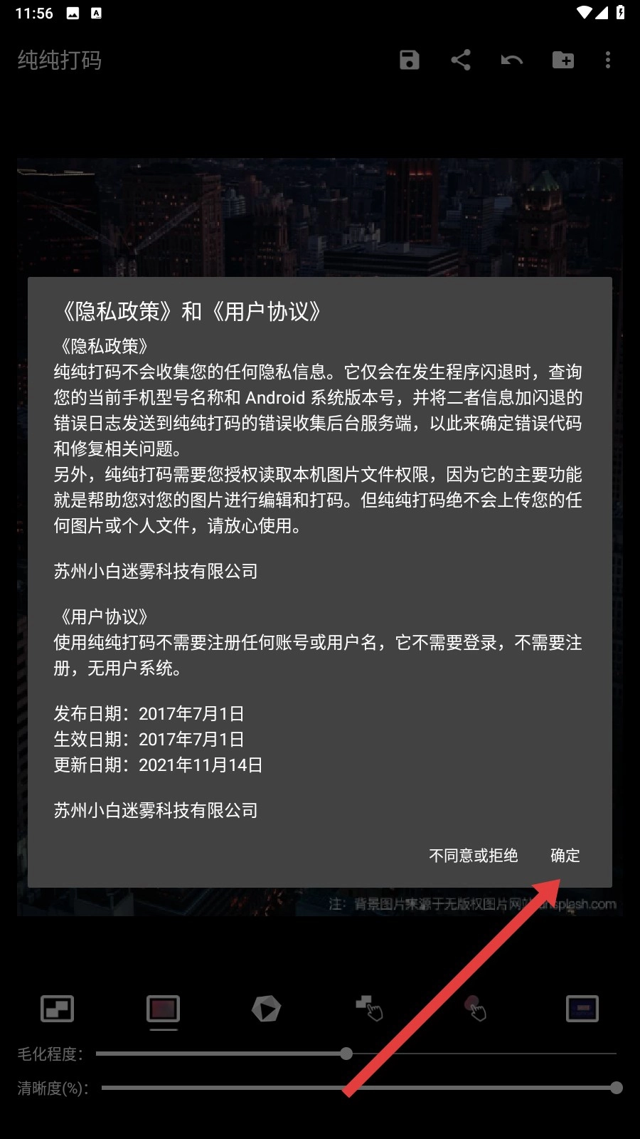 1. 启动纯纯打码应用程序,点击隐私政策与用户协议弹窗里的确认按钮
