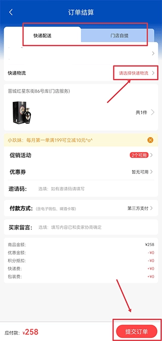 3、选择配送方式后点击提交订单即可