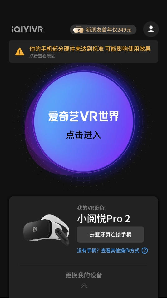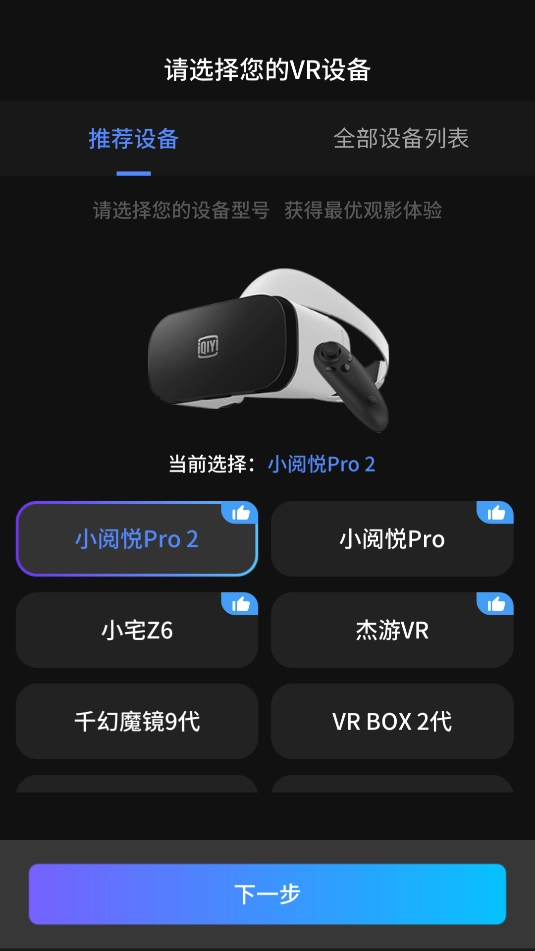 1、打开爱奇艺VR应用,选择VR设备后点击下一步