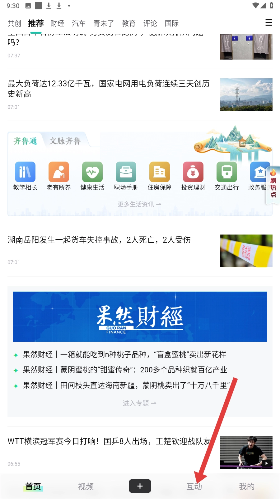 1、打开齐鲁壹点,点底部【互动】选项,进入互动功能页面。