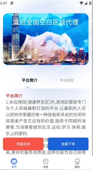 2. 平台简介、我要接单以及我要下单等功能,在首页就能直接看到。