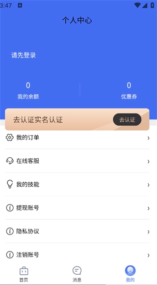 4. 点击页面底部的“我的”选项,就能查看我的订单、在线客服、我的技能等相关功能。